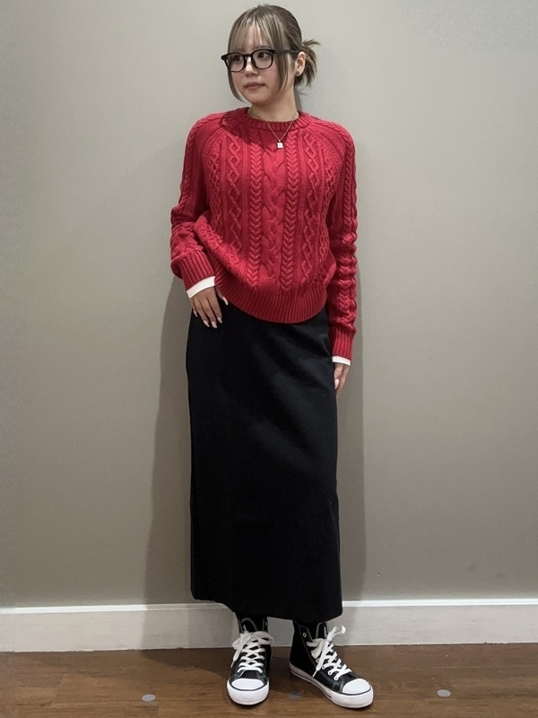 赤色のニットを使って黒でピシッと大人コーデを組んでみました!