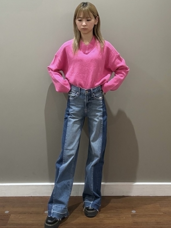 自宅でも洗えるニット!デニムパンツと合わせると脚長効果!