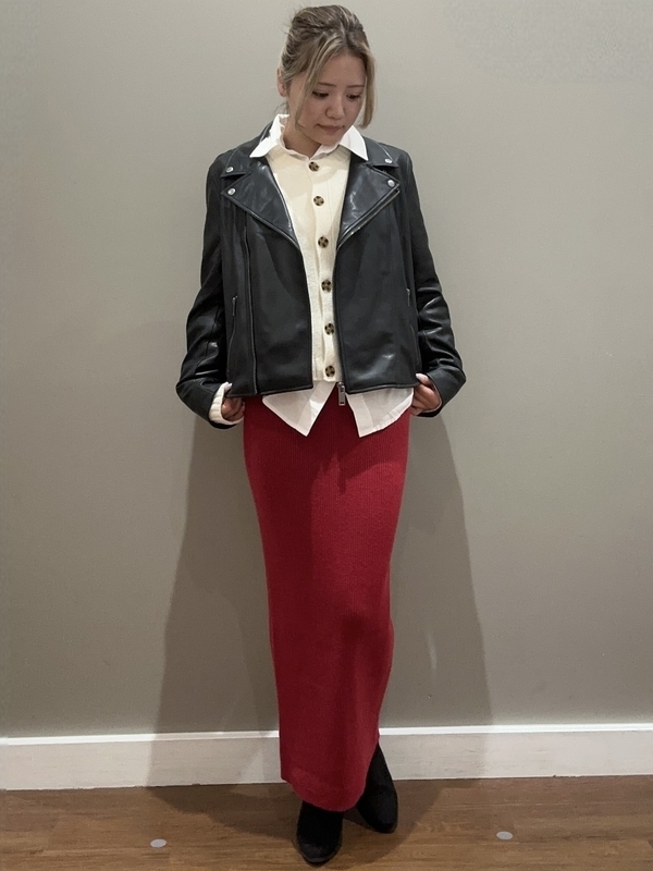 赤のスカートとレザージャケットで大人かっこよくコーデを組んでみました!