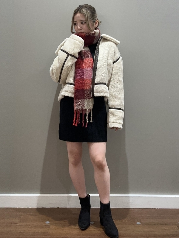 モコモコのボアコートで女性らしく、コートを着なくても可愛いコーデになってます!