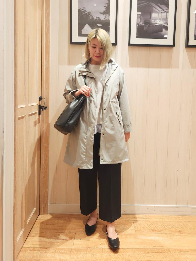 グリーンのミリタリーコートは花粉付着防止生地。