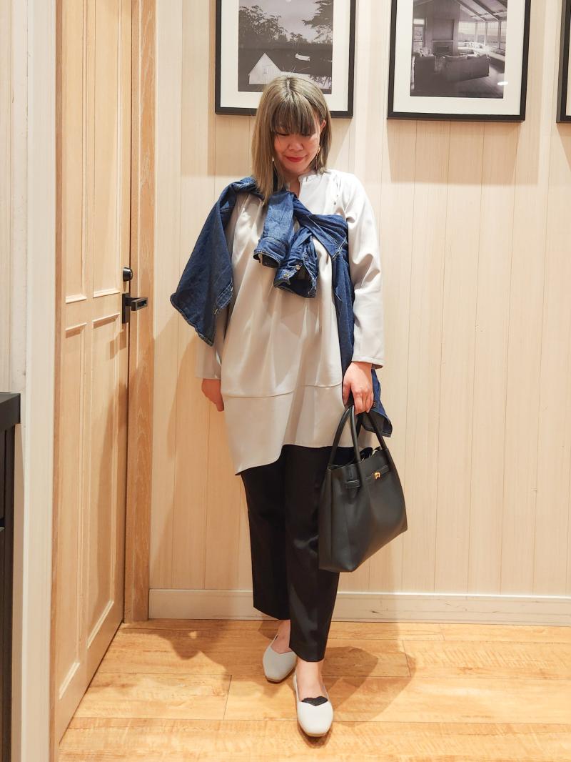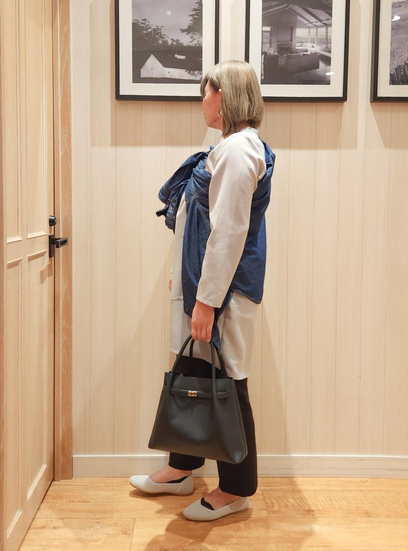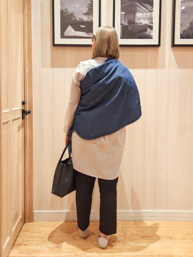定番のデニムシャツはたすき掛けにし、コーディネートのアクセントにし、こなれ感のある大人コーデの完成♪