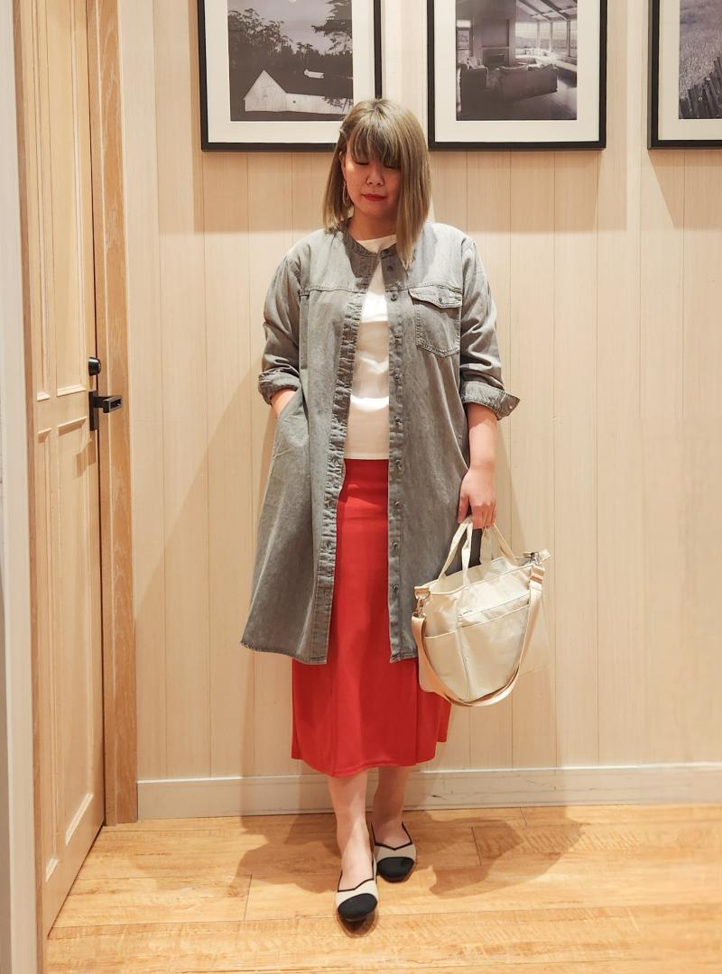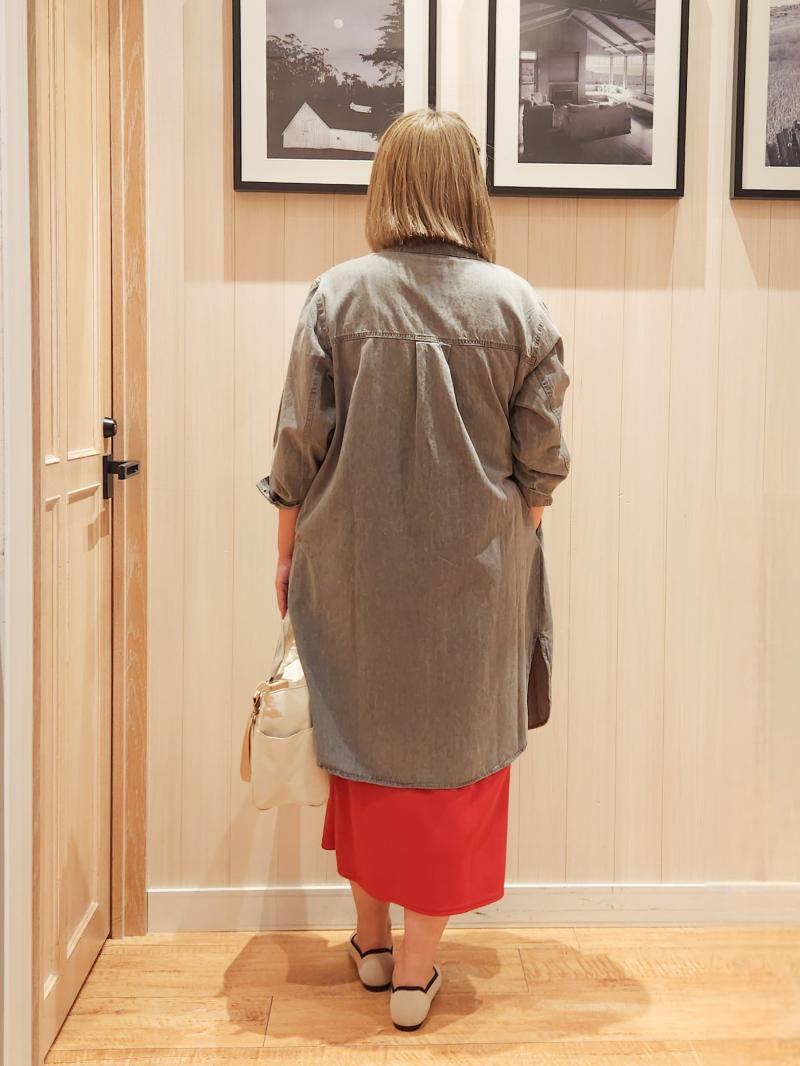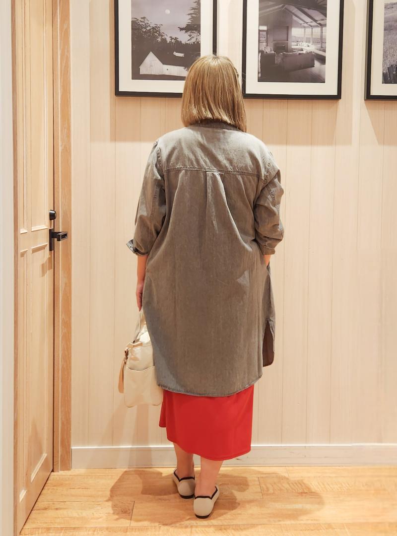ナロースカートで腰周りのラインが出てしまったので、シャツワンピでしっかりカバー。