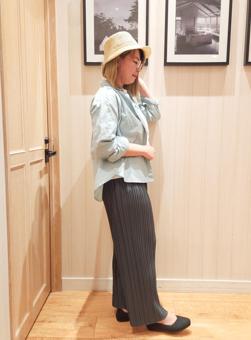 爽やかなグリーンのシャツを羽織りスタイルに、インナーは大人っぽい印象になるロゴTを、パンツはプリーツパンツでIラインシルエットにしました。
